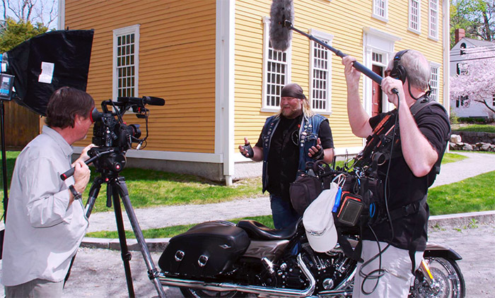 Pictured left: Stan is with Susan Bennett and Jane Morse of the Lexington Historical Society. Above: Stan is pictured with members of the production crew filming outside the Hancock/Clarke House in Lexington. (Photo by Jim Shaw)