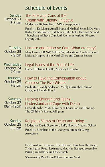 Jane Eckert read an article on this question by Scott Helman in the April 2012 Boston Globe Magazine, and she was so moved by the story that she decided to bring an idea to her minister at First Parish in Lexington, Reverend Peter Boullata. “This is something that we never talk about,” Jane says, “that we don’t know how to talk about, and I thought, ‘wouldn’t is be great if we could do something on end of life issues at the parish?’”